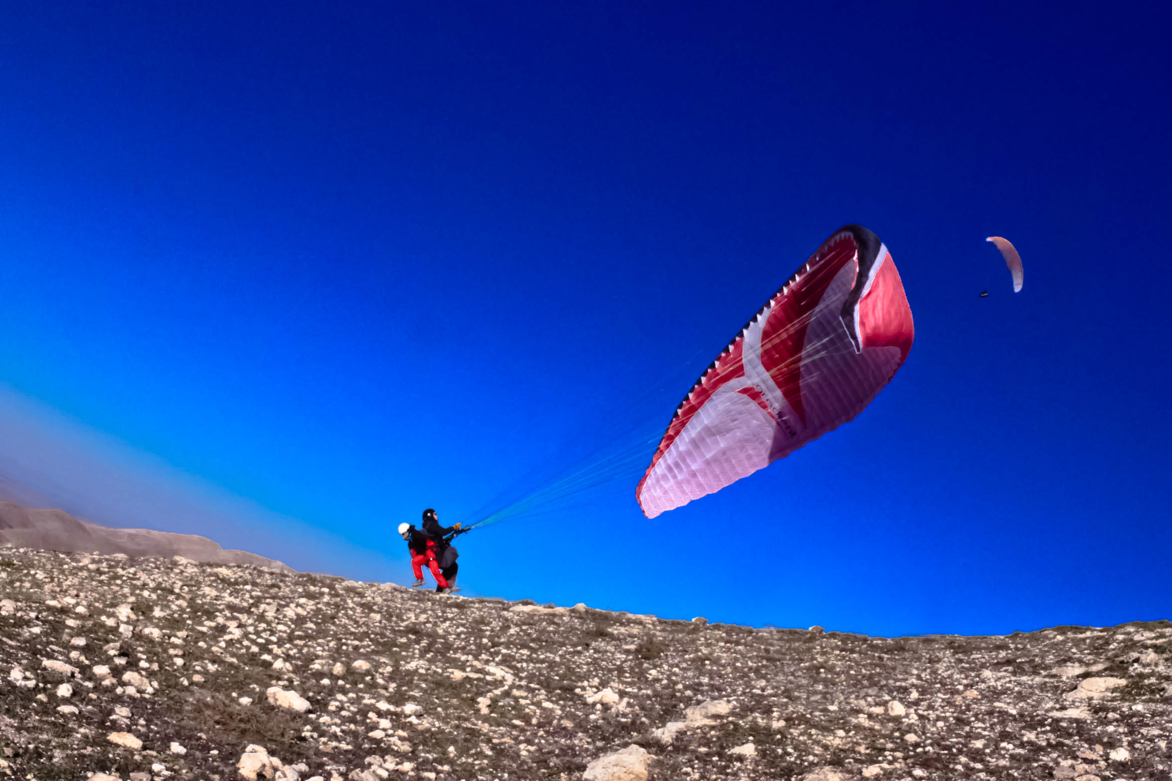 Morocco dunes organise paragliding trips to fly in all Morocco, as Atlas mountain,cost and in desert. Our experience start on 2007 with defferent schools as paragliding school inferno, Cloudbase... Our trips include Transport,accomodation,meals and experienced guide. -Informations Paragliding in Morocco- on the edge of the High Atlas mountains Paragliding in Morocco:Average autumn and spring temperatures are around 25°C on the plains of Marrakesh. The reliable north-easterly breezes feed the warm air directly up onto our favourite flying sites (Aguergour and Ait Ourir) on the edge of the High Atlas mountains. Aguergour take-off rises some 500m above the plains. As the sun warms the plains below, a constant flow of smooth thermodynamic lift sets up, allowing us to soar high above the Berber villages, an abandoned fort, hundreds of children, mosques and wandering flocks of sheep and goats. All the ingredients for a perfect afternoon flying! Cross country flying is also possible on the plain in front of take-off. Ait Ourir takes a slightly more westerly wind direction with a ridge offering many miles of soaring. Further into the High Atlas, spectacular flying opportunities abound. For example, towards the end of the week our safari meanders south through some unforgettable scenery to the infamous Tiz’n’Test pass. Conditions here can be strong in the early afternoon, but for evening flying the 2000m take-off (1,500m height difference between take-off and landing!) presents us with stunning vistas of the sweeping Sous valley far below.